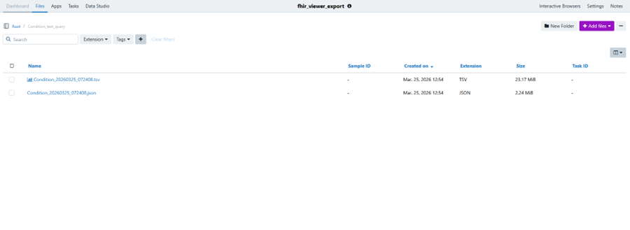 After export, the viewer writes files into the Project and folder you choose. The exact filenames may vary by configuration, but typically include the resource type and a timestamp. • Example: Condition_20260325_072408.json • Example: Condition_20260325_072408.tsv