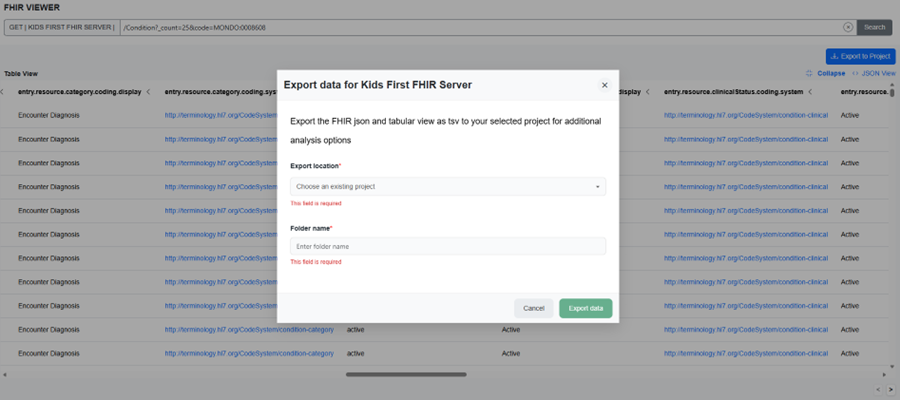 • JSON export: saves the raw server payload (Bundle). • TSV export: saves the flattened Table view.