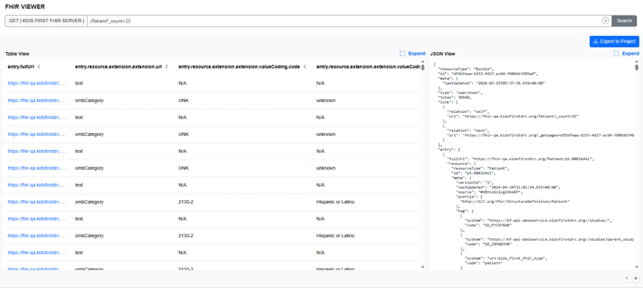 The FHIR Viewer presents this data side by side as raw JSON and a flattened table, helping users explore, understand, and validate resource content and relationships while retaining the full fidelity of the underlying FHIR response. Users can run free‑form queries across any resource supported by the connected server to better understand how research and clinical data are represented and connected.